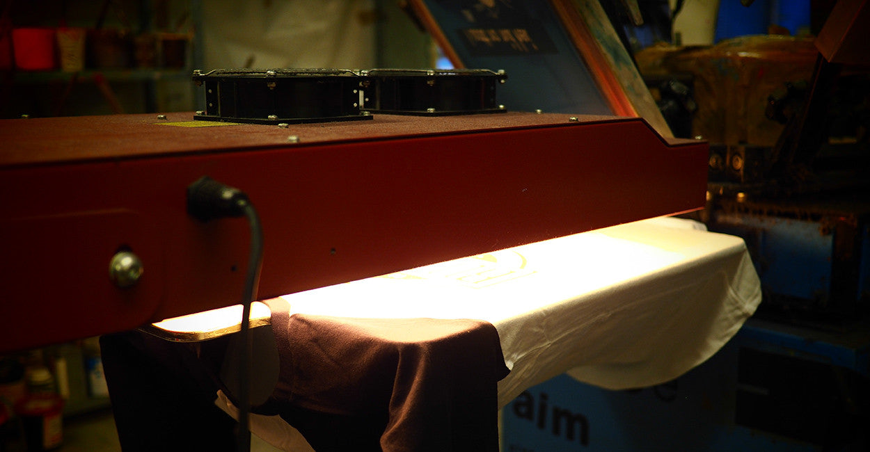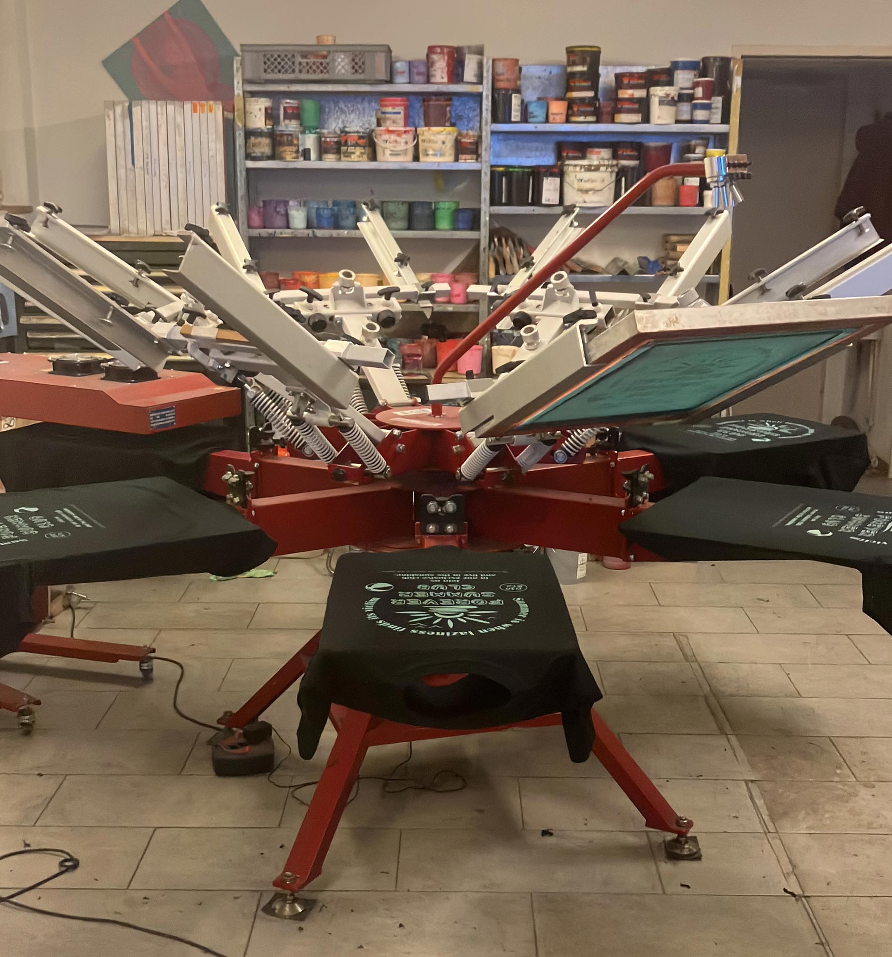 Wir arbeiten mit klassischem Handsiebdruck auf einem Karussell mit bis zu sechs Druckstationen. Jede Farbe wird dabei nacheinander mit separatem Sieb aufgetragen. Für brillante Ergebnisse setzen wir auf Plastisol-Farben, die bei rund 160 °C dauerhaft fixiert werden – schnell und zuverlässig mit unserem Flash-Dryer.